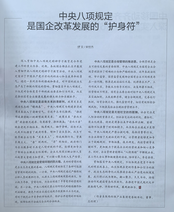 日前出版的《国企》杂志刊发了陕西环保集团党委副书记、董事、总经理宋世杰同志文章《中央八项规定是国企改革发展的“护身符”》。现刊载如下,以飨读者。